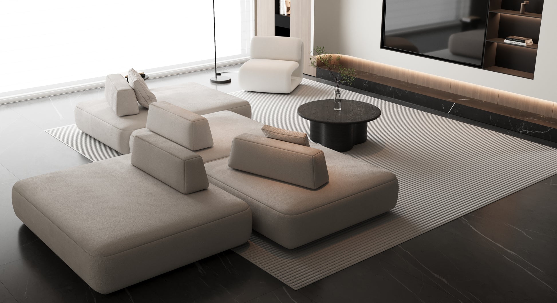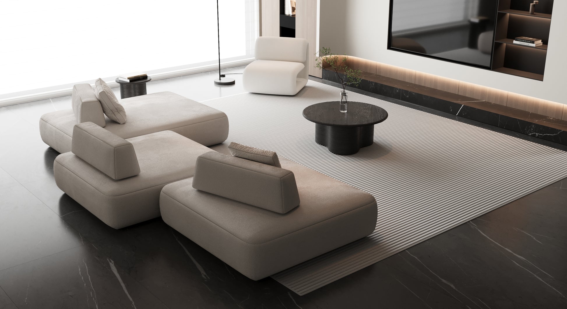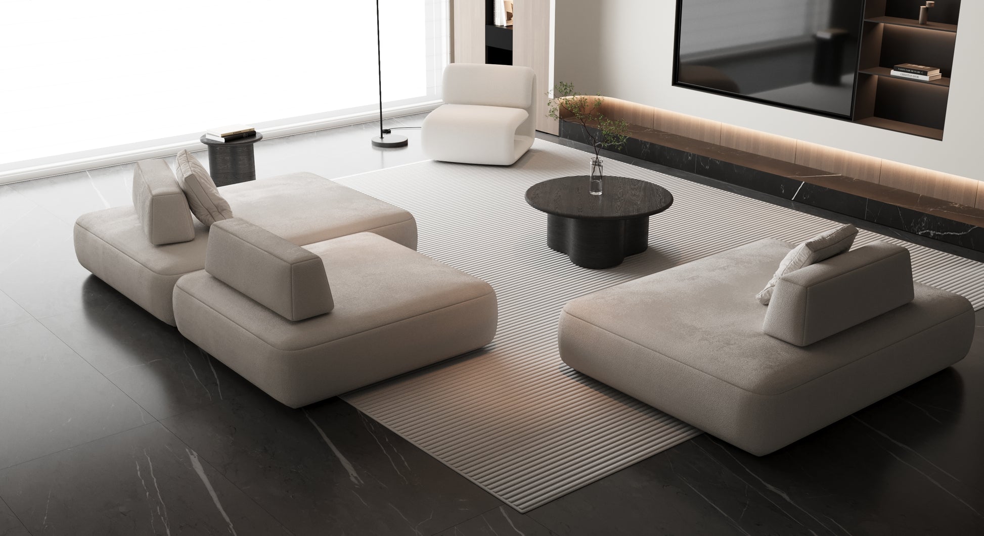 The FlexForm Sofa redefines versatility with its modular four-piece design, crafted to adapt seamlessly to modern living. Its generously padded seats provide exceptional softness and lounge-worthy comfort, while the four independent modules can be rearranged and reconfigured to perfectly fit any space or setting.